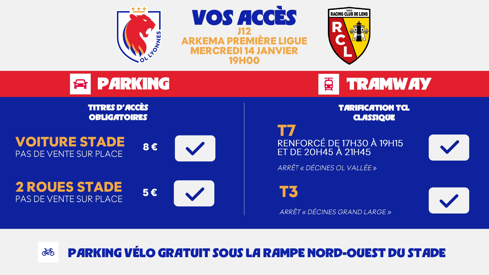 Vous pouvez réserver un parking voiture (8 €) ou un parking 2 Roues (5 €) au Groupama Stadium – pas de vente sur place. Les parkings du stade étant souvent complets à l’approche du match, pensez à réserver dès que possible.